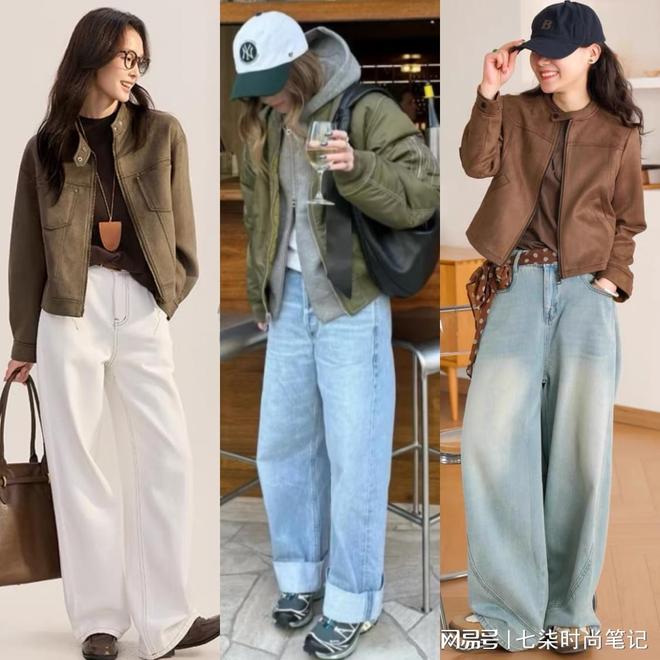 暖棕色夹克搭配白色阔腿裤,整体看起来简约清爽,高级感十足,轻松营造出青春活力的文艺知识分子气质。换成做旧的水洗蓝牛仔裤又能营造出浓浓的复古氛围。