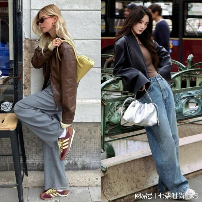 利落的短款皮夹克能够弱化皮衣自身的厚重感,搭配阔腿裤,酷飒中多了几分慵懒随性的时髦,整个人看起来有种放松下来的自信美,可休闲可通勤。
