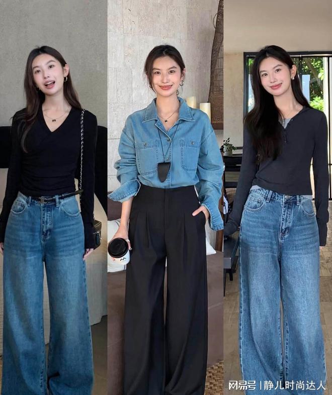 下面这几条牛仔裤,其实都属于稍微宽松一点的设计,整体的裁剪对双腿会宽容一些,在上半身搭配一件短一点的上衣,就会将腿型拉伸到极致。