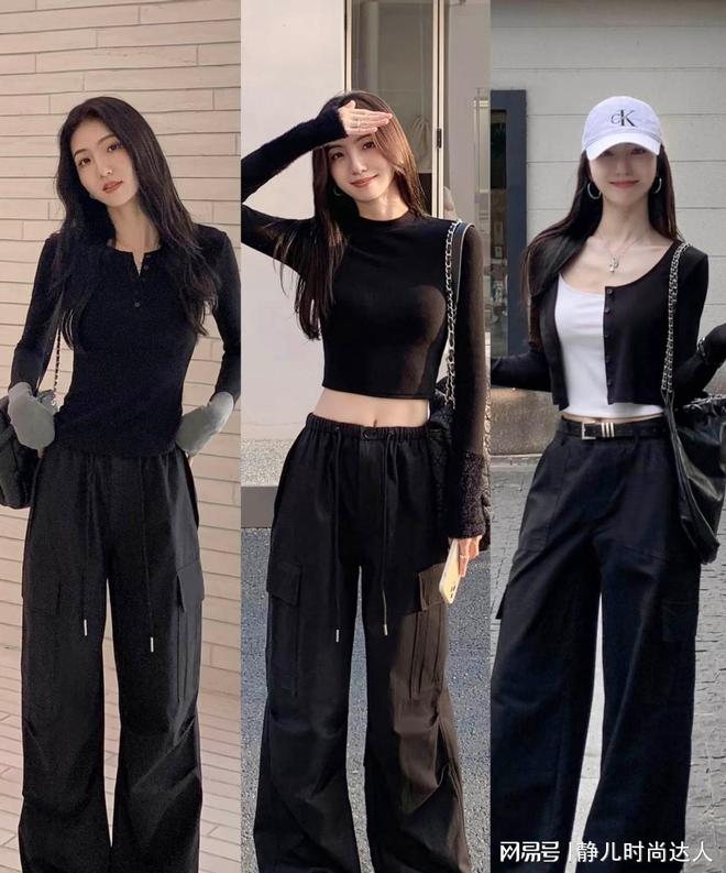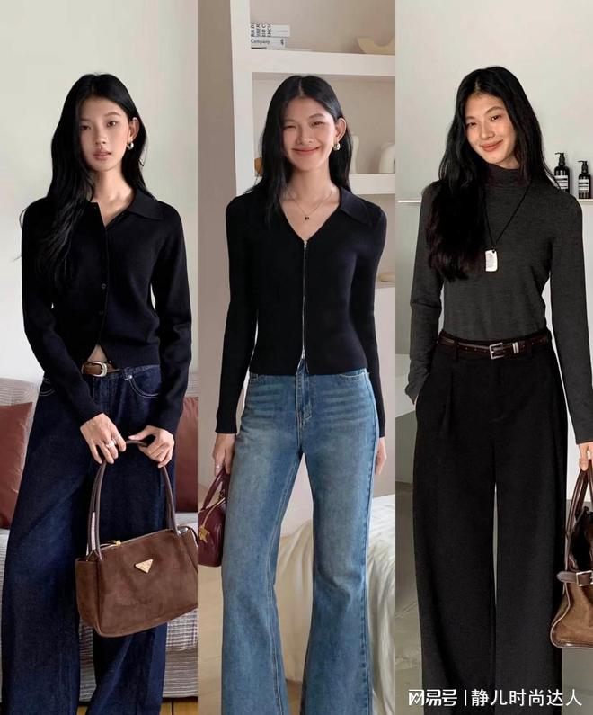 黑色上衣的种类也是很丰富的,进入到了秋季,大家可以准备一件黑色的针织开衫,将纽扣扣起来,就自然的衍生出了v领的裁剪,让女性的颈部曲线看起来更加的修长。