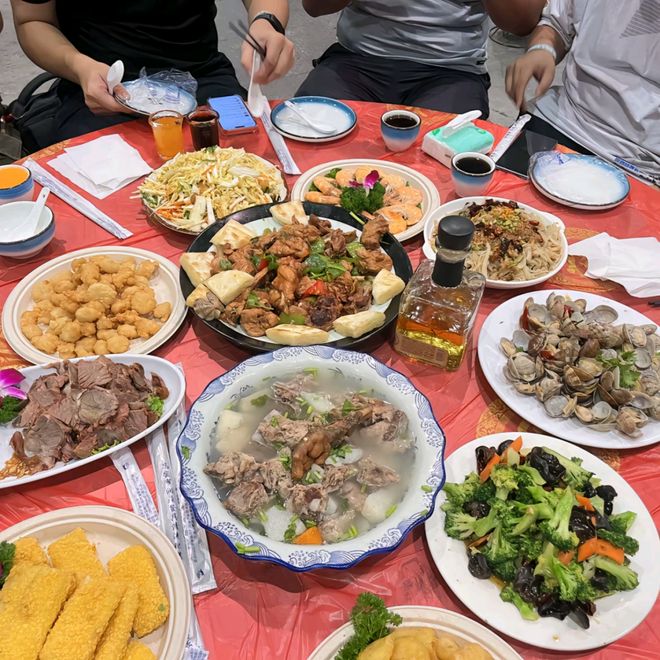 那天的菜量大得惊人。“其实那桌菜,大家根本吃不完。主办方鼓励我们可以把吃剩的饭菜打包回家。”阿修是山东人,她解释道,“在我们山东这叫‘折菜’。把吃席剩下的菜‘折’回家,第二天放锅里再热一遍,做成大锅菜,还能再吃一顿。”
