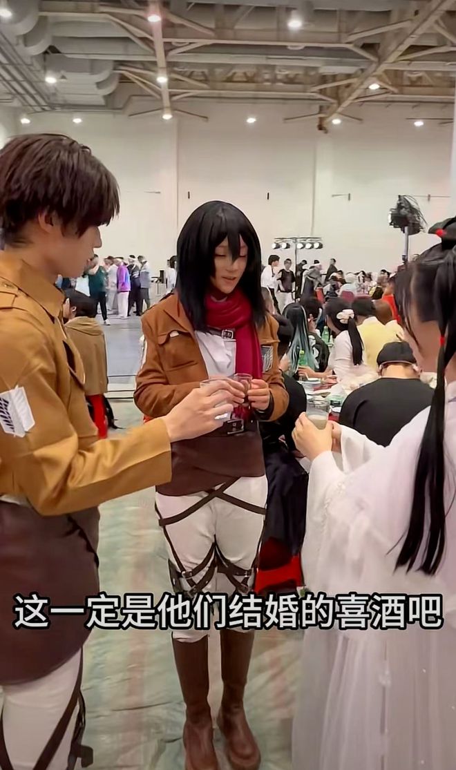 席间的气氛,更像一场婚礼。喜欢同一部作品的coser自然而然坐在一起,当看到自己喜欢的动漫CP(Couple的缩写,特指存在恋爱关系的情侣)同桌举杯,默契地对视、敬饮料,观众忍不住笑出声。