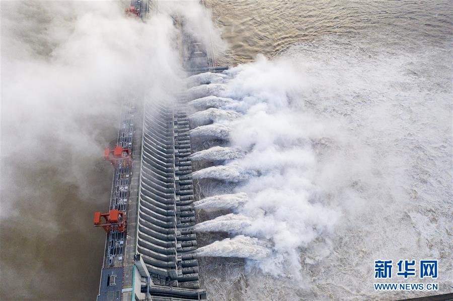 8月19日拍摄的开启泄洪深孔泄洪的长江三峡水利枢纽工程(无人机照片)。 新华社发(郑家裕 摄)